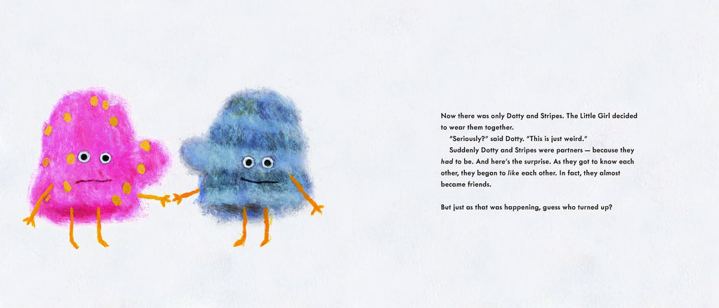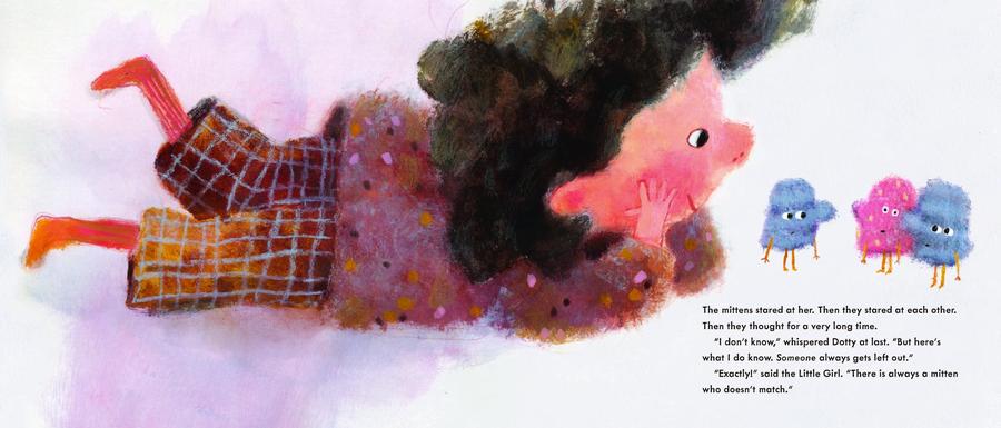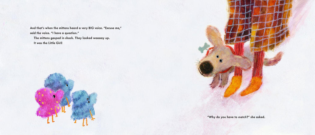 When the Little Girl, who has been listening to their conversations, weighs in with a huge question ("Why do you have to match?"), the mittens are shocked. Then comes their realization that "matching" often means leaving someone out. This prompts the Little Girl to break a fundamental rule of fashion so that individual mittens (and maybe even socks! or shoes!) can be themselves — and everyone can belong.