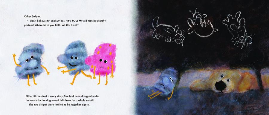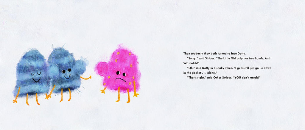 Dotty and Other Dotty are a matching set of mittens. When another mitten, Stripes, loses her partner and becomes a single mitten, they don't feel the need to include her. She doesn't "match" them, so she is banished to the dark, lonely pocket of the Little Girl who owns them. Before long, however, Dotty loses her partner, and now she doesn't match the reunited pair of Stripes and Other Stripes, who in turn banish her to the pocket. "YOU don't match!" they tell her.