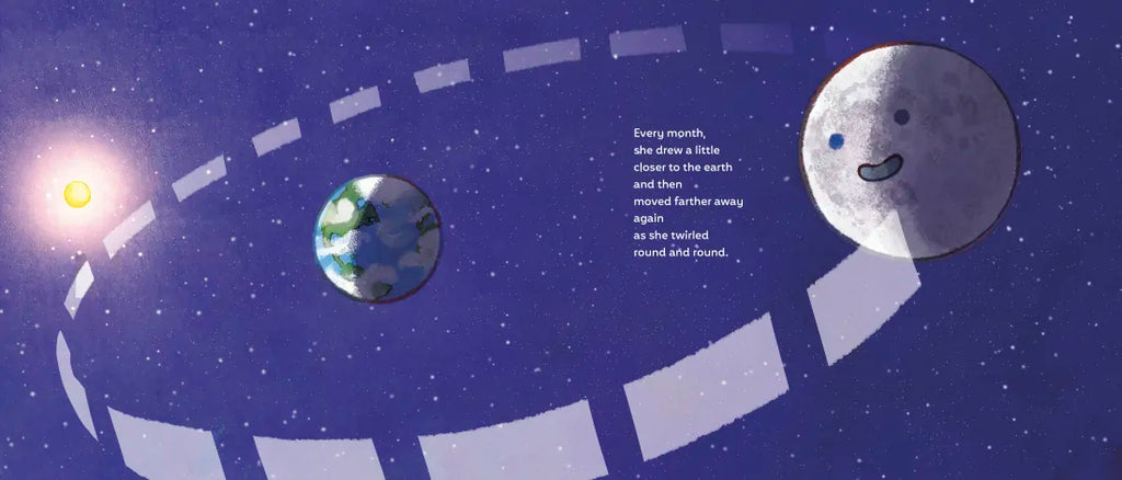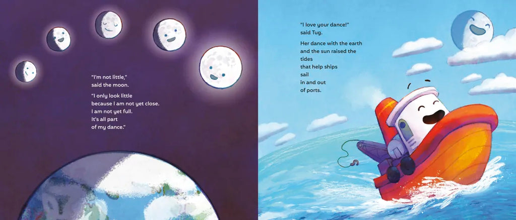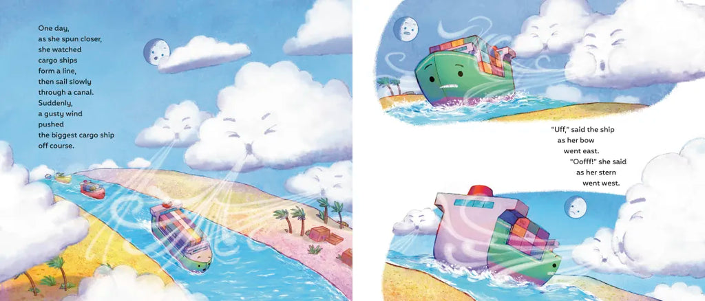 The silver moon sails through the vast blue sky as a cargo ship down below is stuck in a canal. The tugboat tugs until the line goes taut. The diggers scoop up enough sand for a castle. The dredger glugs all the silt he can. But it's no use. For seven long days, the moon watches as the ship stays put, becoming fuller, brighter, closer, until she's finally strong enough to pull the ocean into a mighty tide and save the ship.