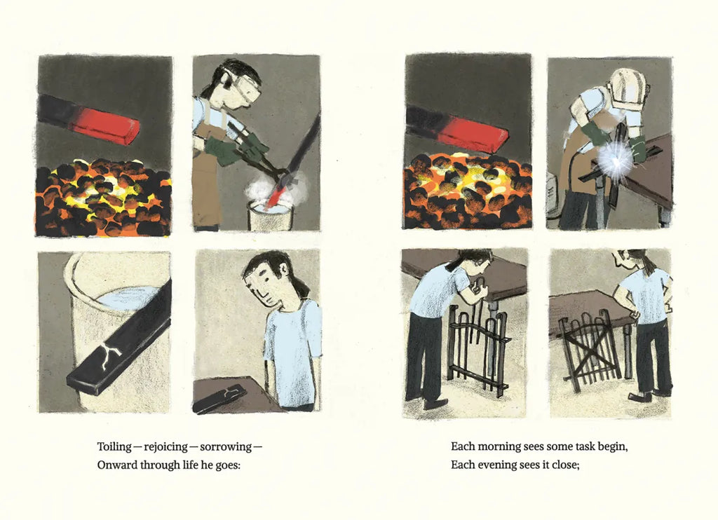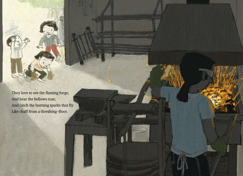 The neighborhood blacksmith is a quiet and unassuming presence, tucked in his smithy under the chestnut tree. Sturdy, generous, and with sadness of his own, he toils through the day, passing on the tools of his trade, and come evening, takes a well-deserved rest. Longfellow’s timeless poem is enhanced by G. Brian Karas’s thoughtful and contemporary art in this modern retelling of the tender tale of a humble craftsman. An afterword about the tools and the trade of blacksmithing will draw readers curious about this age-honored endeavor, which has seen renewed interest in developed countries and continues to be plied around the world.