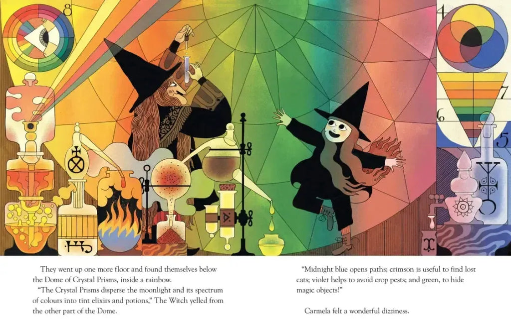 Everything is changing for Carmela. Her older sister, Franca, has new, mean friends, and Carmela is feeling lost and lonely. So she decides to go for a walk—to walk until she can’t anymore, then walk a bit more. Her walking takes her to a strange tower, and what she finds there will transform her life forever. In this companion to The Queen in the Cave, her authorial debut, renowned illustrator Júlia Sardà ventures into a mesmerizing world where mermaid grease washes away envy, a giant’s hair helps you face bullies, a circular library holds all your secrets, and a dome of crystal prisms opens a view to the cosmos. Dreamlike and filled with whimsy, the artist’s kaleidoscopic patterns, decorative borders, glowing colors, and layered, elaborately detailed imagery will bewitch young readers as readily as the title character does Carmela—and beckon them to return for many a visit.