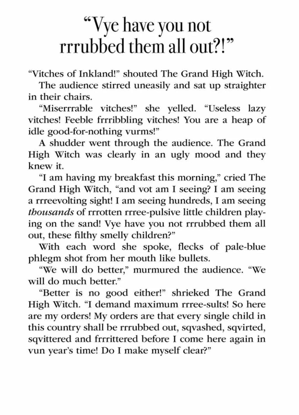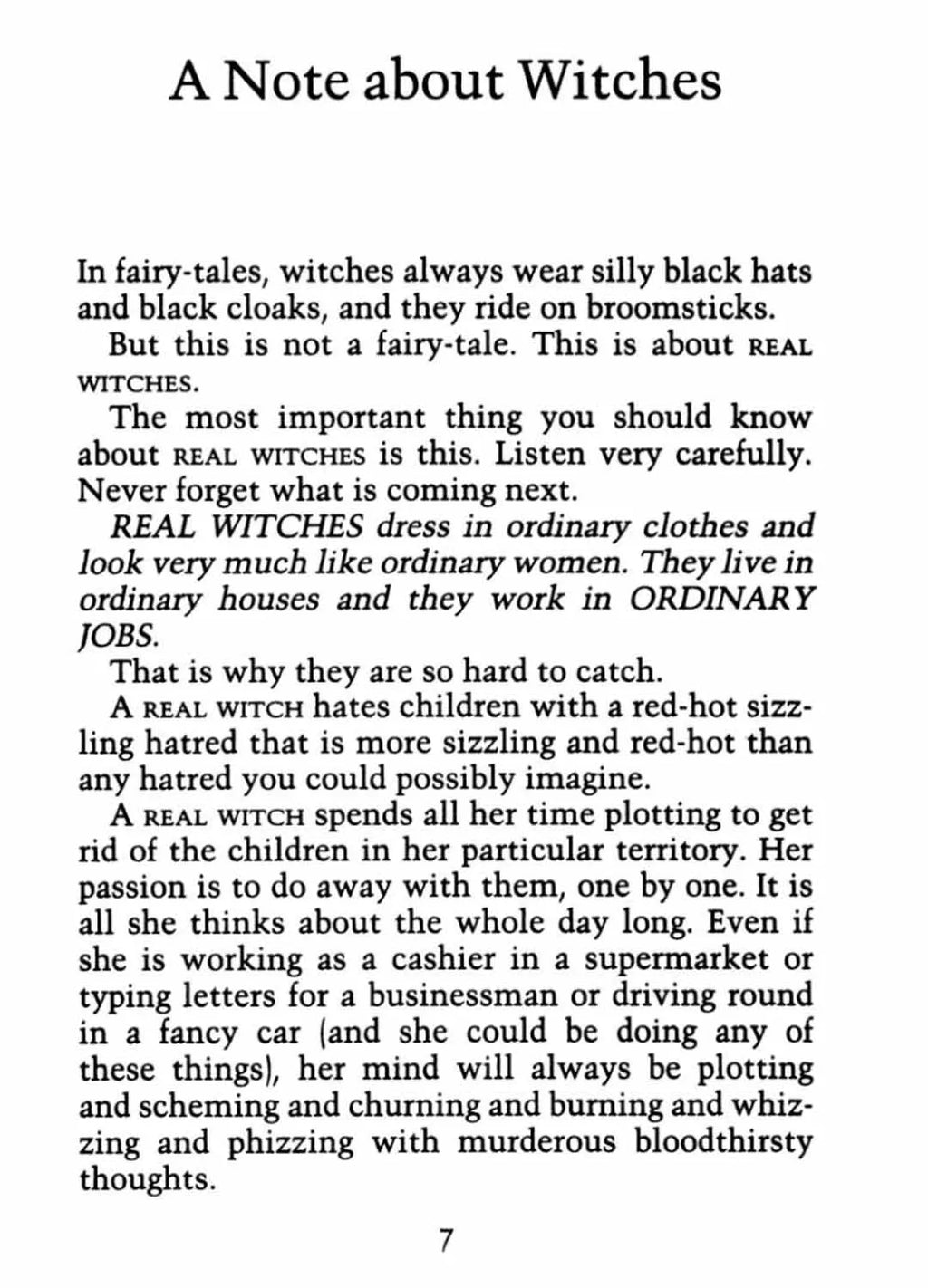 This is not a fairy tale. This is about real witches. Grandmamma loves to tell about witches. Real witches are the most dangerous of all living creatures on earth. There's nothing they hate so much as children, and they work all kinds of terrifying spells to get rid of them. Her grandson listens closely to Grandmamma's stories—but nothing can prepare him for the day he comes face-to-face with The Grand High Witch herself!