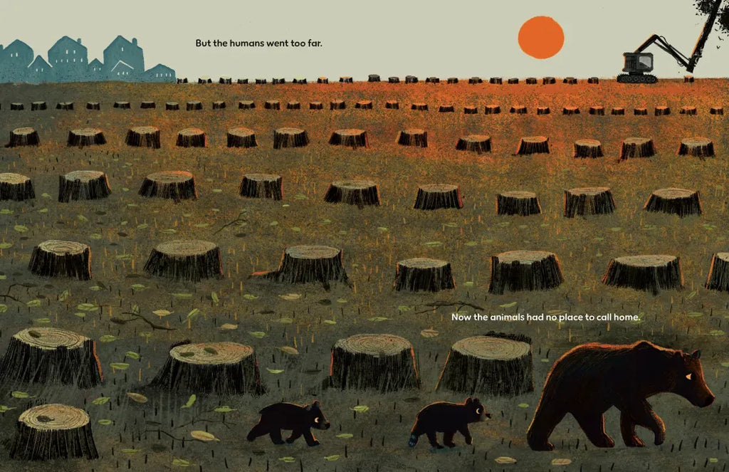 But then the humans went too far and destroyed the forest that the bigger animals called home, so everyone went to Gnome's. He wanted to turn the bigger animals away, but where else would they go? So Gnome found a way to make room for everyone, despite the hotel being a little cramped.