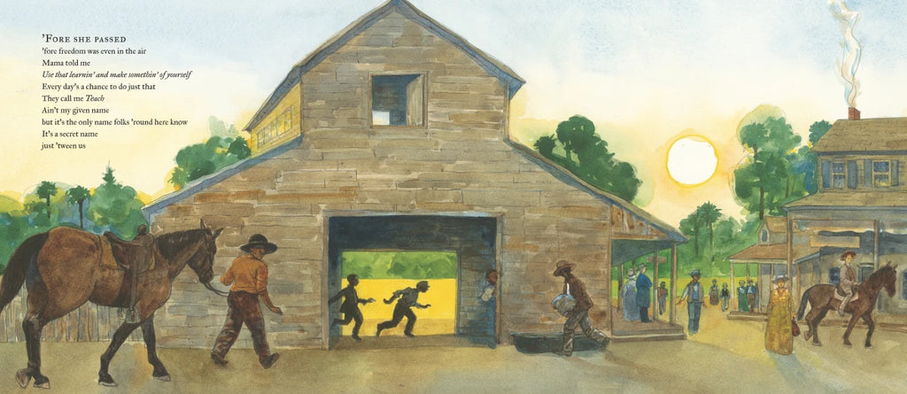 The young man known as Teach secretly learned to read, write, and use numbers growing up alongside the master’s son. And although on this Southern plantation these are skills he can never flaunt, Teach doesn’t keep them to himself: In the course of a week, he’ll teach little ones the alphabet in the corner stall of a stable and hold a moonlit session where men scratch letters in the dirt. He’ll decipher a discarded letter bearing news of Yankee soldiers and forge a pass for a woman hoping to buy precious time on a perilous journey north. And come Sunday, Teach will cross the swamp to a hidden cabin, reading aloud to the congregation God’s immortal words to the pharaoh: Let my people go. With a spare, moving first-person narration told in an era-appropriate dialect, complemented by stunning watercolor illustrations, the celebrated duo of Lesa Cline-Ransome and James E. Ransome honor the bravery and generosity of spirit behind countless untold acts of resistance during the time of slavery. An author’s note highlights the vital role of literacy and education toward the securing of freedom, both historically and to the present day.