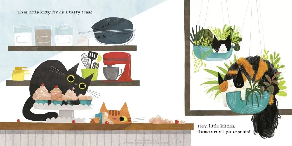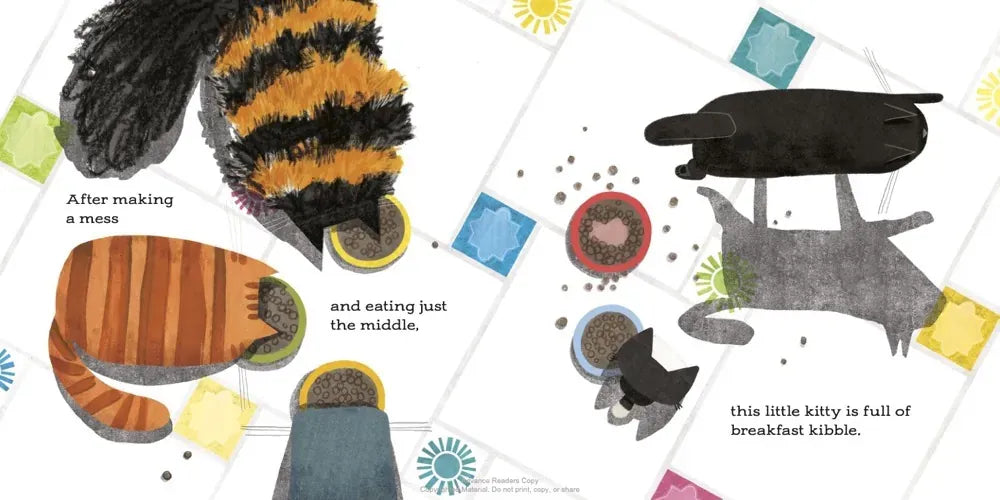 This little kitty starts the day and meows, “Wake up! It’s time to play! All the little kitties get out of bed. Their bellies grumble—it’s time to be fed."