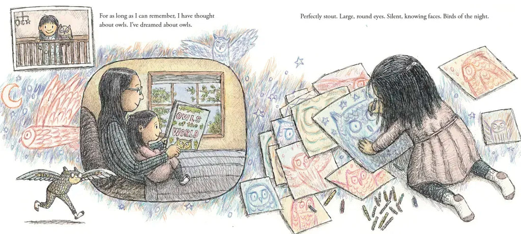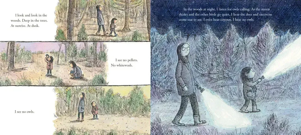 Her teacher, Mr. Koji, a fellow bird-lover, shares that he, too, waited a long time to see an owl. He assures her, “If you are very quiet and very patient, and if you look very close, you might just find them.”