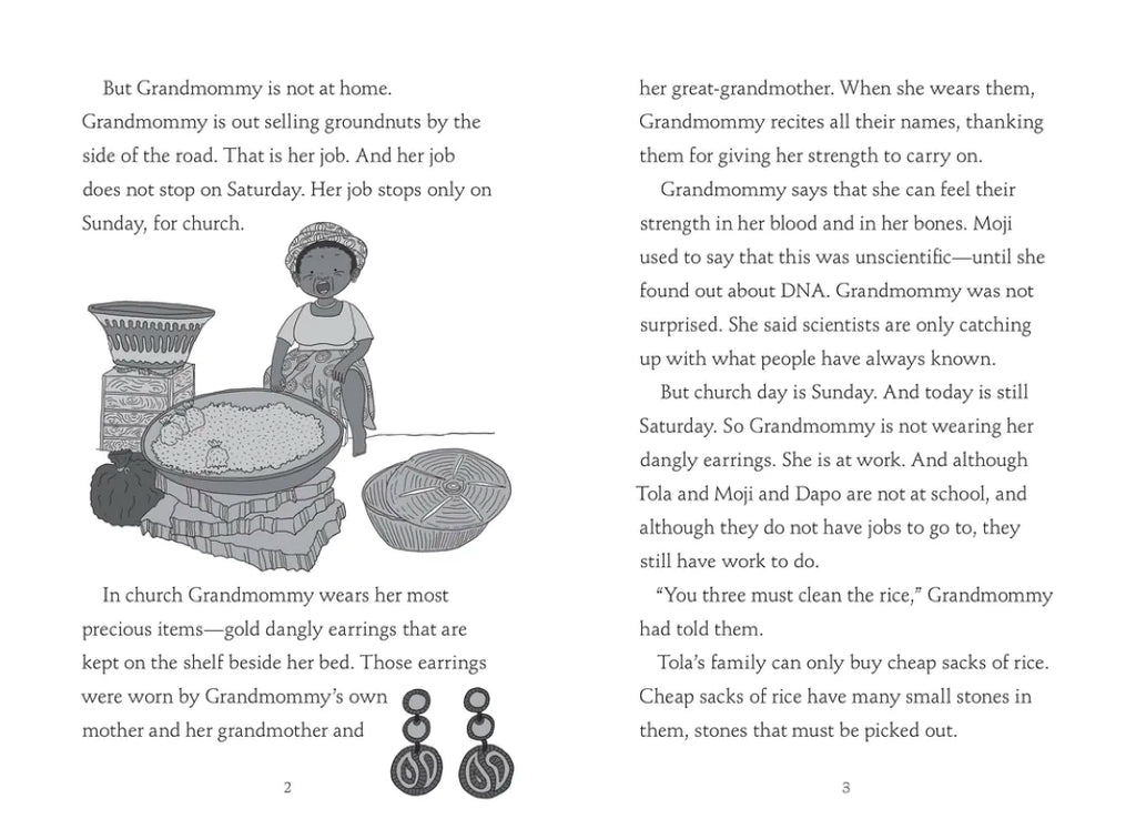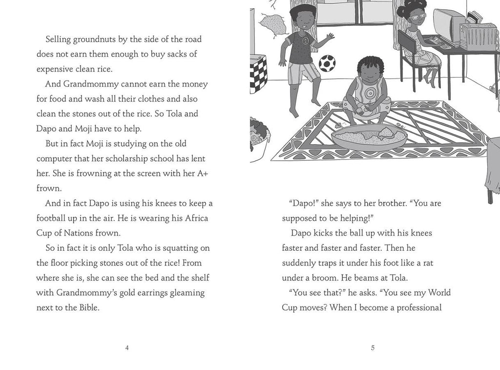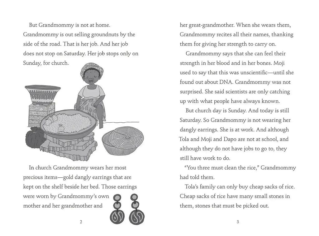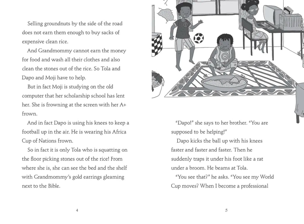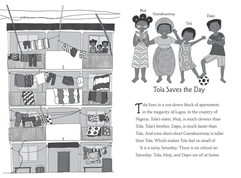 Three charming stories about a young girl who lives in a flat in Lagos with her sister, Moji, who is very clever; her brother, Dapo, who is very fast; and Grandmummy, who is very bossy. Too Small Tola is just the right size to fit under the bed and rescue Grandmummy's most prized possession when it goes missing. Her abilities in maths prove to be very helpful when Grandmummy becomes ill. In the title story, though Grandmummy can't afford to buy Tola new clothes, Tola turns out to be just as fine as the three fine girls she so greatly admires. A book full of heart and humour by multi-award-winning author and storyteller Atinuke, with artwork by Onyinye Iwu, a fabulous new talent in children's illustration.