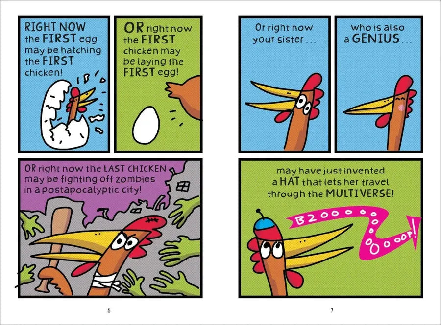 Our zany hero, Two-Headed Chicken, has traveled the multiverse using the AstroCap and romped through the chronoverse using the TimeCap. Now they dare to ask: What happens if they use both caps at the same time? Answer: Chaos! Unfortunately, the chaos is so ridiculous that the reader slams their book closed, trapping the double-noggined main character in eternal darkness. But wait! Two-Headed Chicken escapes into the Cosmic Library, which contains every book ever written. Now, still pursued by the chicken-hungry moose Kernel Antlers, Two-Headed Chicken hops their way through a parade of familiar titles, from a hundred-acre wood to a kissy vampire novel, interacting with the befuddled characters and leaving mayhem in their wake. With interactive puzzles and activities and wall-to-wall jokes, Tom Angleberger delivers another absurdist delight in this madcap series.