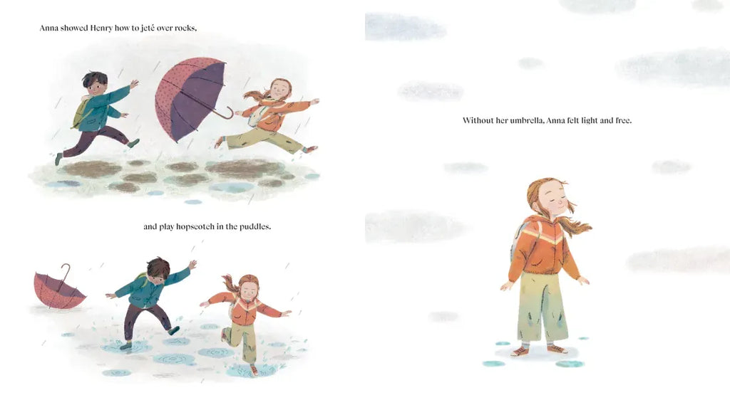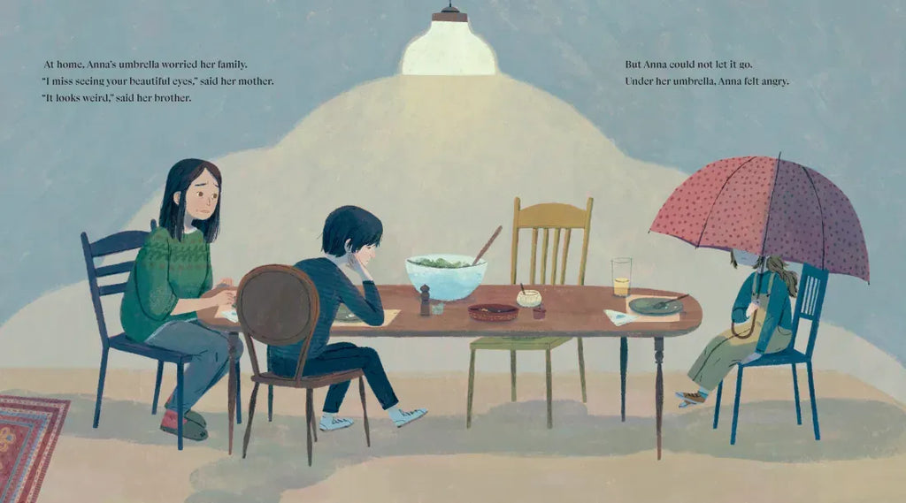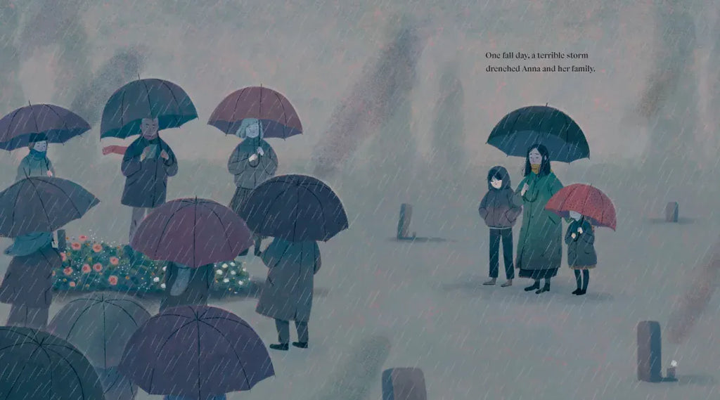 Anna never goes anywhere without her umbrella. Not since the stormy day of her father’s funeral. Under her umbrella, she feels safe—safe to be angry and sad. She refuses to put away her umbrella no matter the weather, both outside and in. And then one rainy day she notices a boy getting drenched, and when she invites him under the umbrella with her, things begin to change.