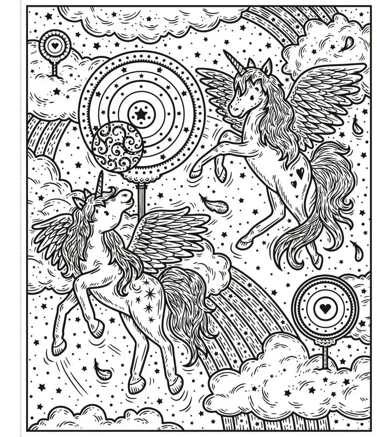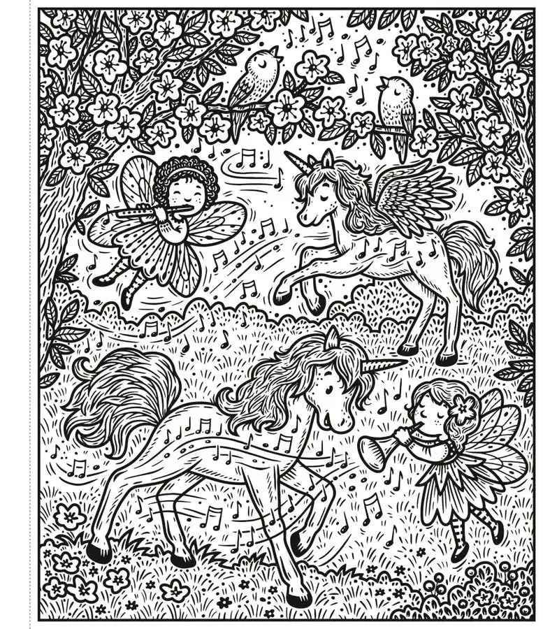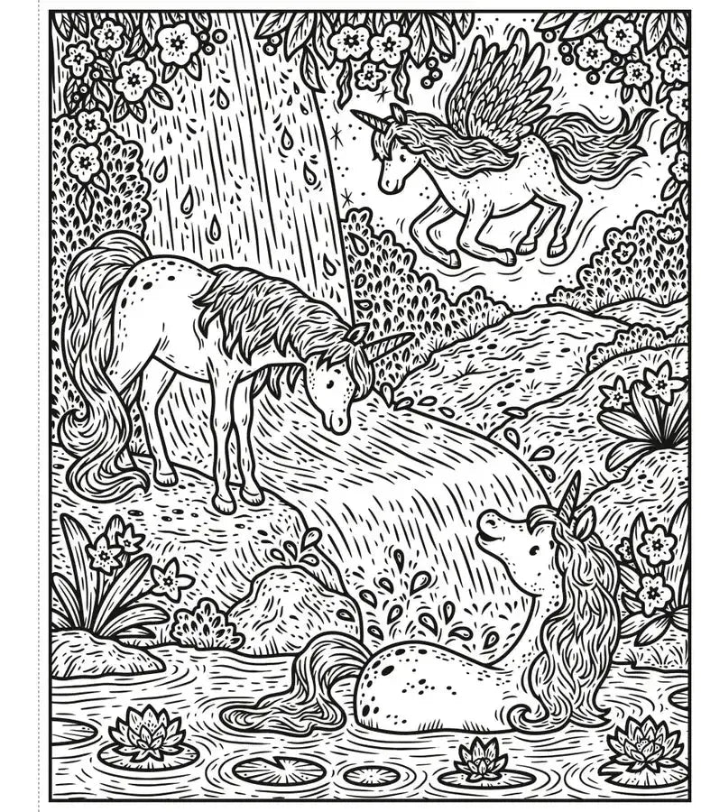 Discover an enchanted land full of unicorns frolicking with fairies, butterflies and mermaids amid magical gardens, palaces and pools. Simply brush water over the black and white designs to reveal captivating colours.
