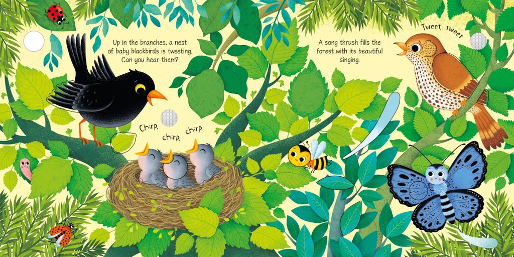 Little children will love hearing the birds sing as they press the pages of this enchanting book. Each beautifully illustrated scene has simple text and cut-out shapes to discover, and a sound button to press to hear different bird sounds including baby blackbirds tweeting, a magpie chattering, ducklings quacking and a cuckoo singing.