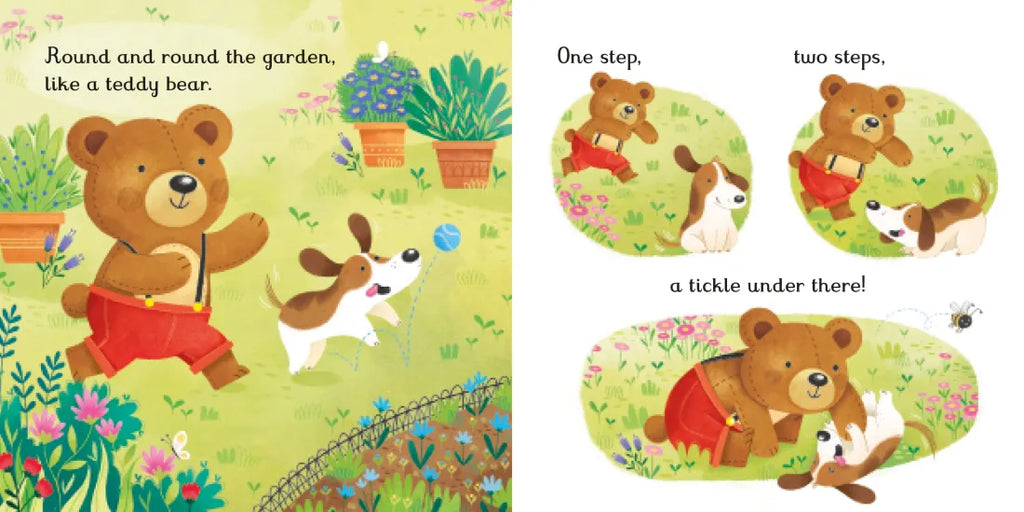 Round and round the garden, like a teddy bear. One step, two steps, a tickle under there! Join Teddy Bear and his friends in this charming version of the much-loved rhyme for little children, with adorable illustrations by Elisa Ferro throughout.