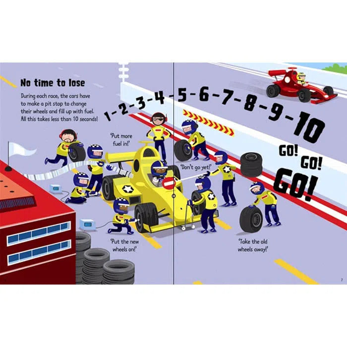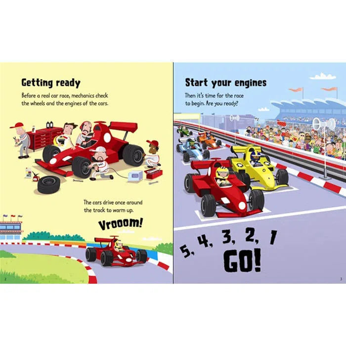 An action-packed book with two wind-up model racing cars to race against each other on the tracks embedded in the thick card pages. With fun facts about racing cars and pit stops and the world of racing.
