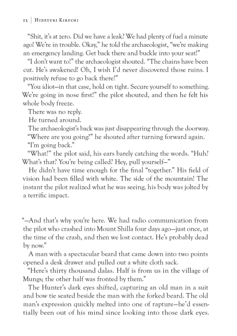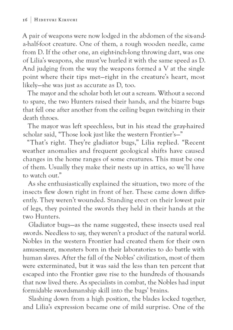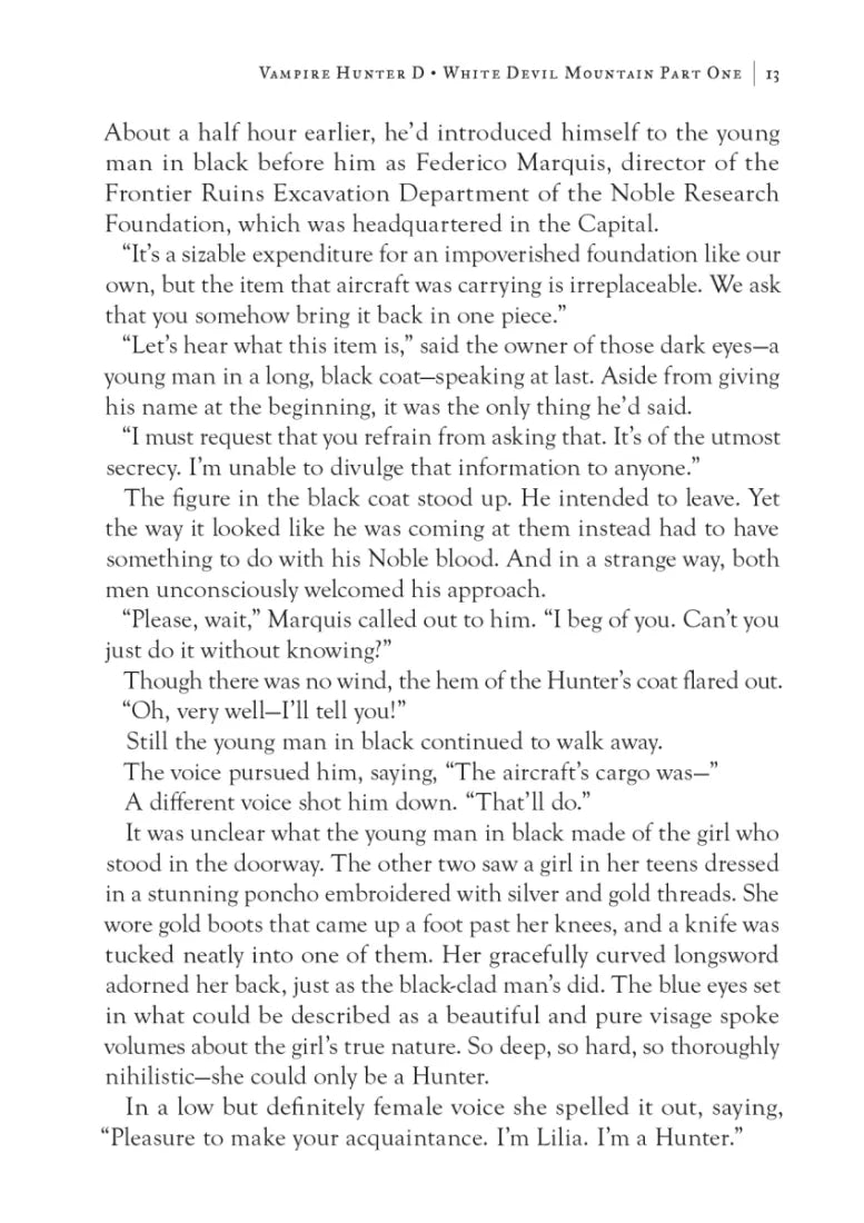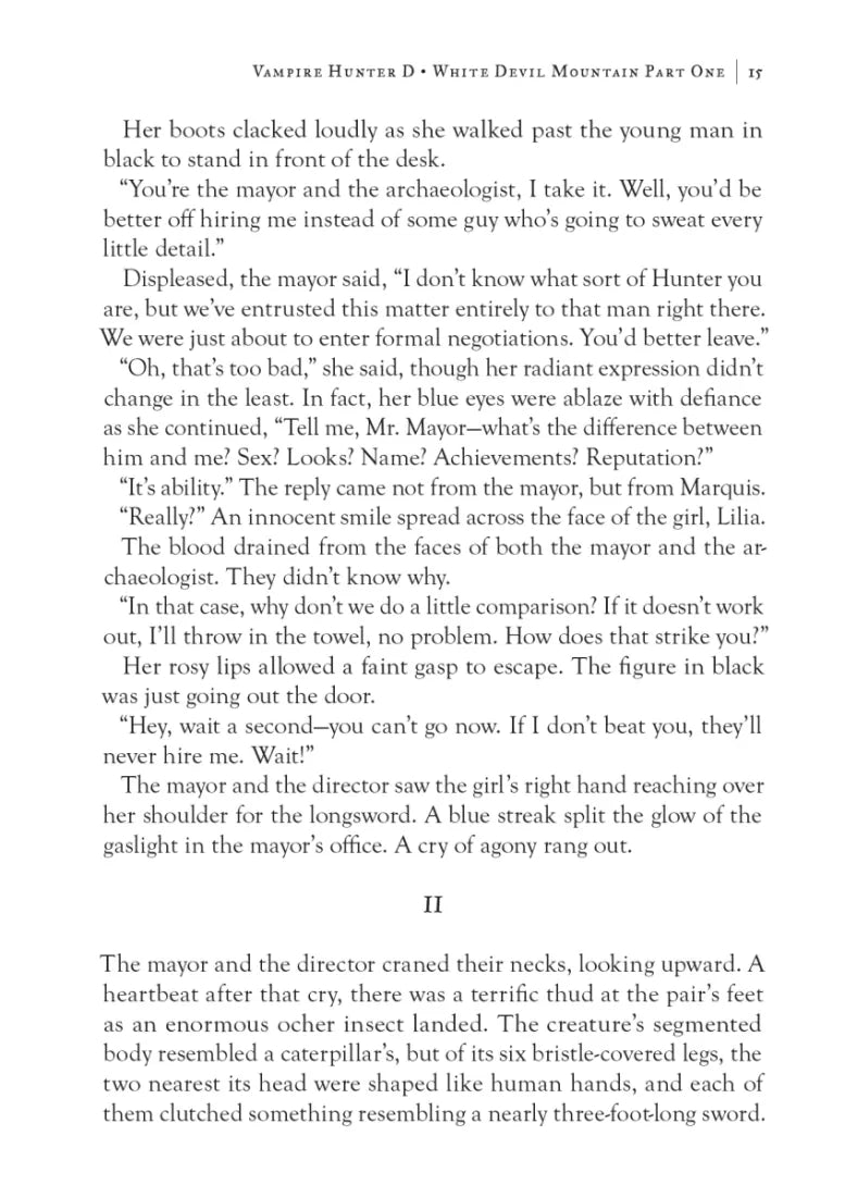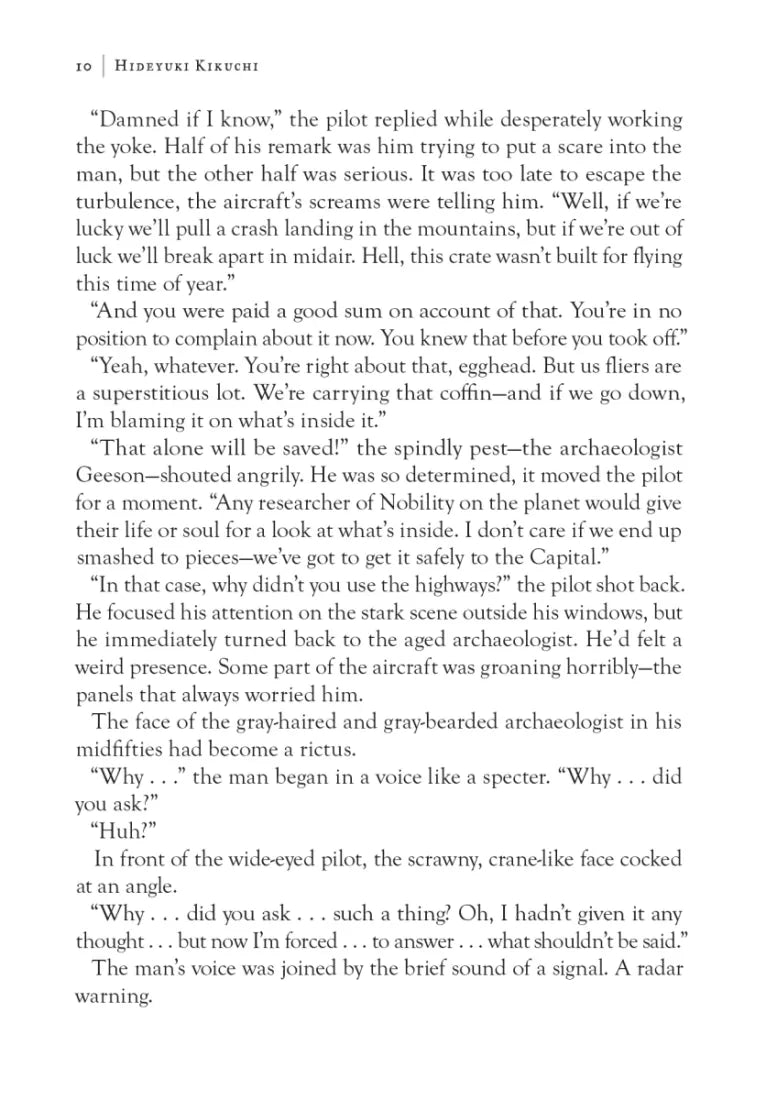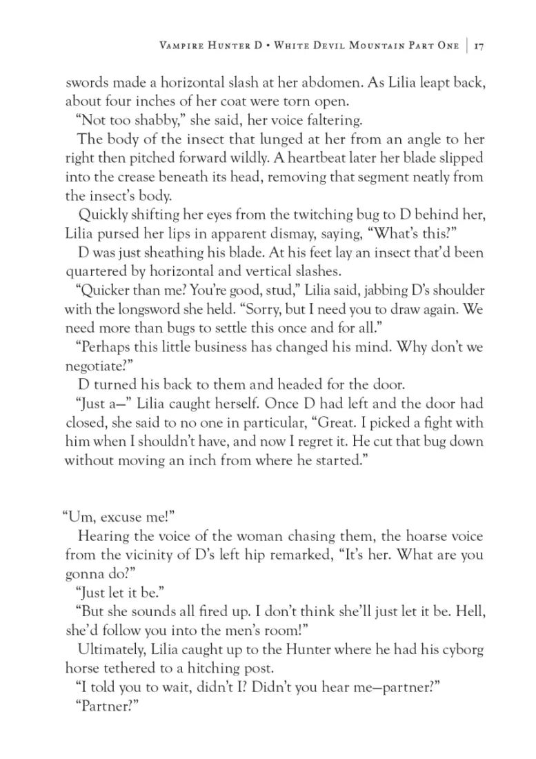 The hunt continues in the bizarre far future of 12,090 A.D, where the immortal vampire lords who were the only winners of mankind’s nuclear war still oppress the human survivors who have pushed the blood-drinking fiends back to the lawless Frontier. Yet humanity too remains as quick as ever to prey upon itself, and where the law can’t bring safety or justice, the crescent blade of D will—assuming you meet the half-vampire wanderer’s price!