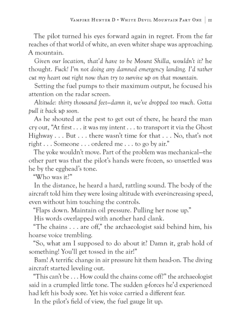 Vampire Hunter D Omnibus Book Eight collects three different complete novels. White Devil Mountain Parts One and Two is the setting of the first: a frightening peak perpetually shrouded in snow—and a desolate gravesite for Duke Gilzen, a vampiric Noble hated even by his own kind, whose coffin D must now retrieve!