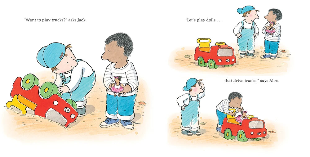 Jack likes trucks. Alex likes dolls. What will they play together? Their new favorite game, of course!