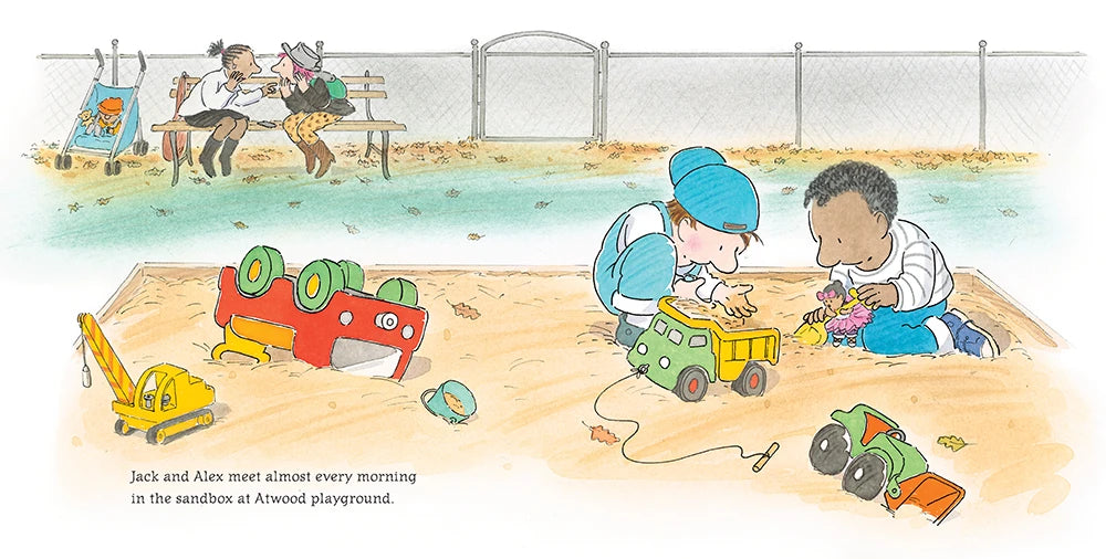 Jack and Alex meet almost every morning in the sandbox at the playground. Jack likes trucks — big ones, the kind that can wreck things. Alex likes dolls — pink ones, with sparkles. And tutus. But Jack doesn’t want to play dolls, and Alex doesn’t want to play trucks. Readers will smile at the quintessential playground squabble on display in this amusing, relatable tale from Ann Stott and Bob Graham. Luckily for Jack and Alex, the day is saved with a little bit of compromise — what about dolls who drive trucks? — and the easy acceptance that characterizes the youngest of friendships. Not to mention a familiar jingle from nearby that reminds Jack and Alex of something else they both like: ice cream!