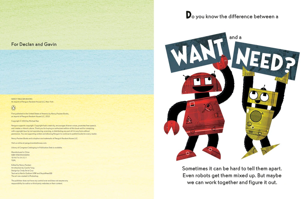 In his witty companion to the popular Facts vs. Opinions vs. Robots, New York Times bestselling author-illustrator Michael Rex shows us why what we want isn’t always the same as what we need.