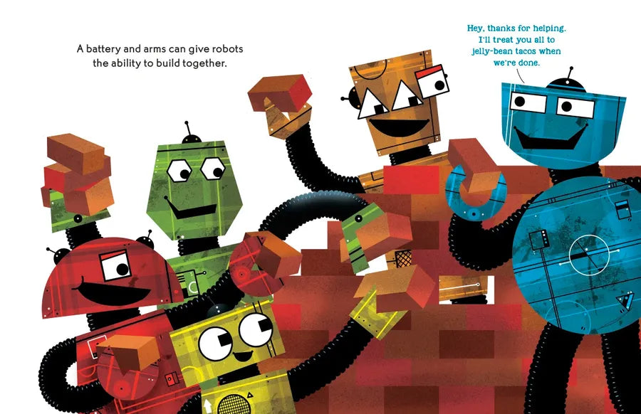 Do you know the difference between a want and a need? It can be a hard thing to understand, especially when you want something so much that you feel like you have to have it. But some things aren’t essential—like jellybean tacos and groovy boots. Other things are essential—like fuel and feet to put the boots on. The robots in this book are here to show you the difference as they make trades to get some things they really want (hooray!) but give away some things they need (oops!).