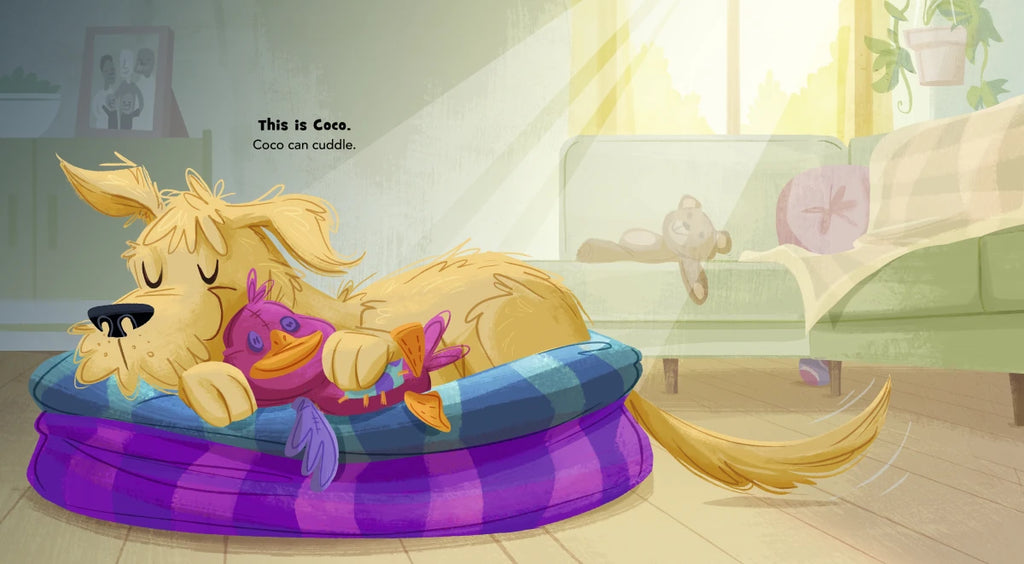 Coco is a dog who can cuddle. He’s not like Luna, who lives with cheetahs at the zoo, or super sniffer Lucky or Jax the lifeguard dog. From cattle dogs to four-footed movie stars, there is no end to canine achievement. But Coco, in his special vest, is no less exceptional: he can bring comfort to a person with a fearful, lonely, or hurting heart. His cuddling makes others feel stronger and less alone. From a beloved picture book author and a gifted illustrator, this irresistible tribute to the therapeutic genius of dogs brims with warmth and humor. With art that captures the energy of accomplished canines at work and at play (often at the same time), this joyful roundup of talented pooches—punctuated every couple of pages by a cuddle with Coco—will send you straight to the couch for a snuggle with someone special.