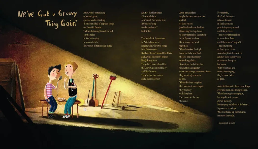 Long before they became one of the most beloved and successful duos of all time, Paul Simon and Art Garfunkel were just two kids growing up in Queens, New York — best friends who met in a sixth-grade production of Alice in Wonderland and bonded over girls, baseball, and rock ’n’ roll. As teens, they practiced singing into a tape recorder, building harmonies that blended their now-famous voices until they sounded just right. They wrote songs together, pursued big-time music producers, and dreamed of becoming stars, never imagining how far their music would take them. Against a backdrop of street-corner doo-wop gangs, the electrifying beginnings of rock ’n’ roll, and the rise of the counterculture folk music scene, G. Neri and David Litchfield chronicle the path that led two young boys from Queens to teenage stardom and back to obscurity, before finding their own true voices and captivating the world with their talent. Back matter includes an afterword, a discography, a bibliography, and a fascinating list of song influences.