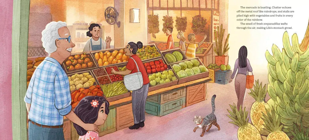 Off to the market they go, guided by a faded recipe that takes them through the stalls, where each ingredient sparks a warm memory. As Lila and her abuelo learn to lean on each other, Abuela’s words help them recreate a dish that tastes like love.