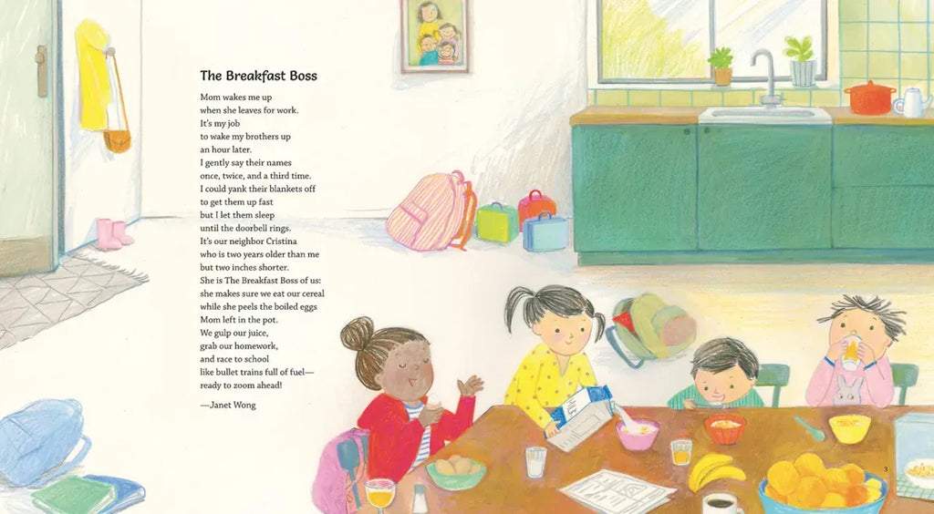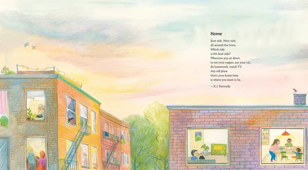 Home is shoes tucked under the bed while you sleep, or fancy-dancying at the neighborhood block party. It’s buttermilk biscuits and gospel music at the church picnic. It’s traffic lights and parked cars; rooftop views as far as you can see; ice cream trucks and yellow boots; sharing breakfast cereal and boiled eggs with your brothers; or running through sprinklers with water on your lips, dripping from eyelashes like fat raindrops. Whether we hang our hats in a walk-up apartment in the city, a farmhouse in the country, or any place in between, the poems in this collection celebrate the places where we live: our homes, our streets, our towns. Gathered by eminent poet and anthologist Paul B. Janeczko, these thirty-four inviting verses are paired with light-filled illustrations by Hyewon Yum evoking the warm details of daily life.