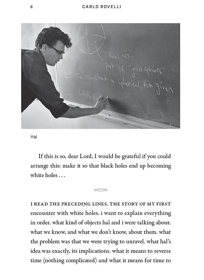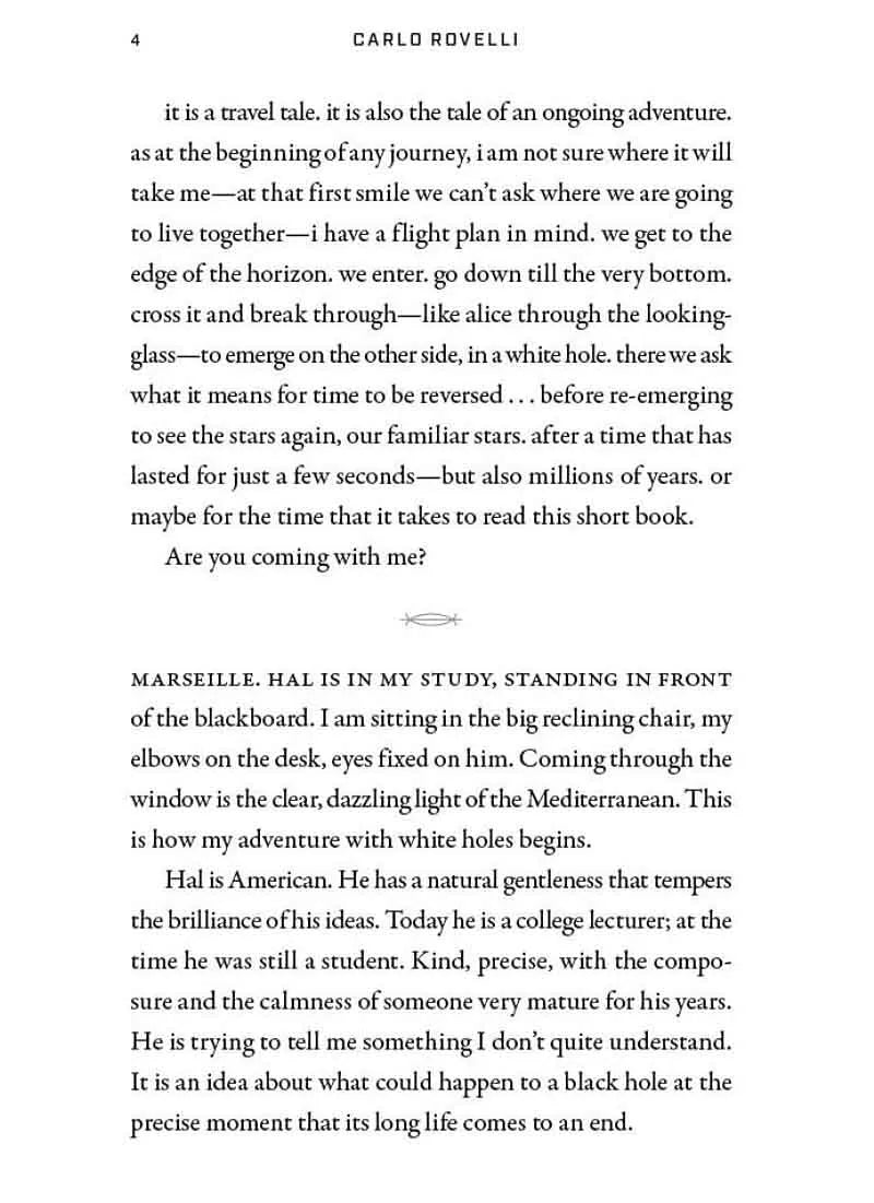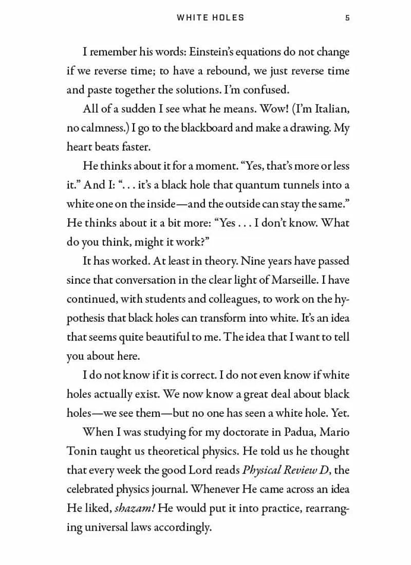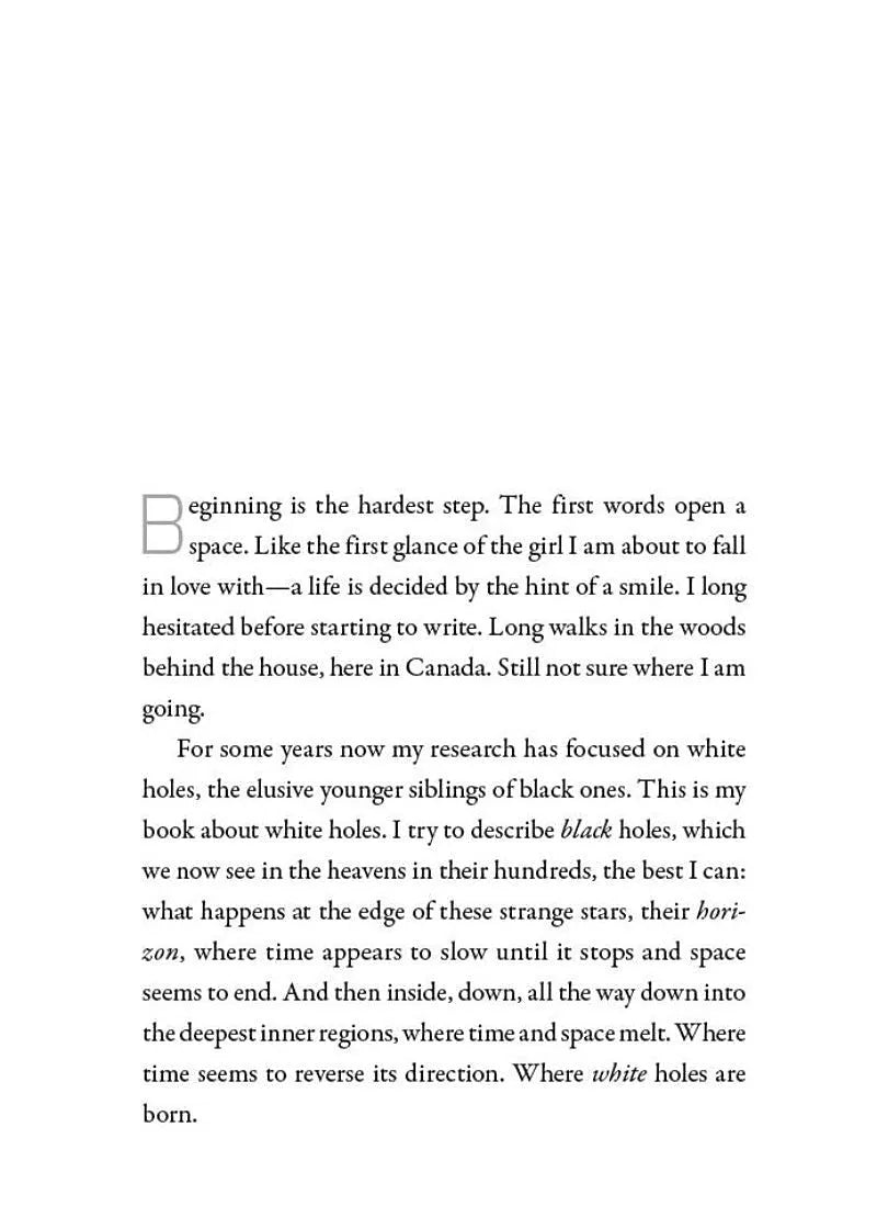 Rovelli writes just as compellingly about the work of a scientist as he does the marvels of the universe. He shares the fear, uncertainty, and frequent disappointment of exploring hypotheses and unknown worlds, and the delight of chasing new ideas to unexpected conclusions. Guiding us beyond the horizon, he invites us to experience the fever and the disquiet of science—and the strange and startling life of a white hole.
