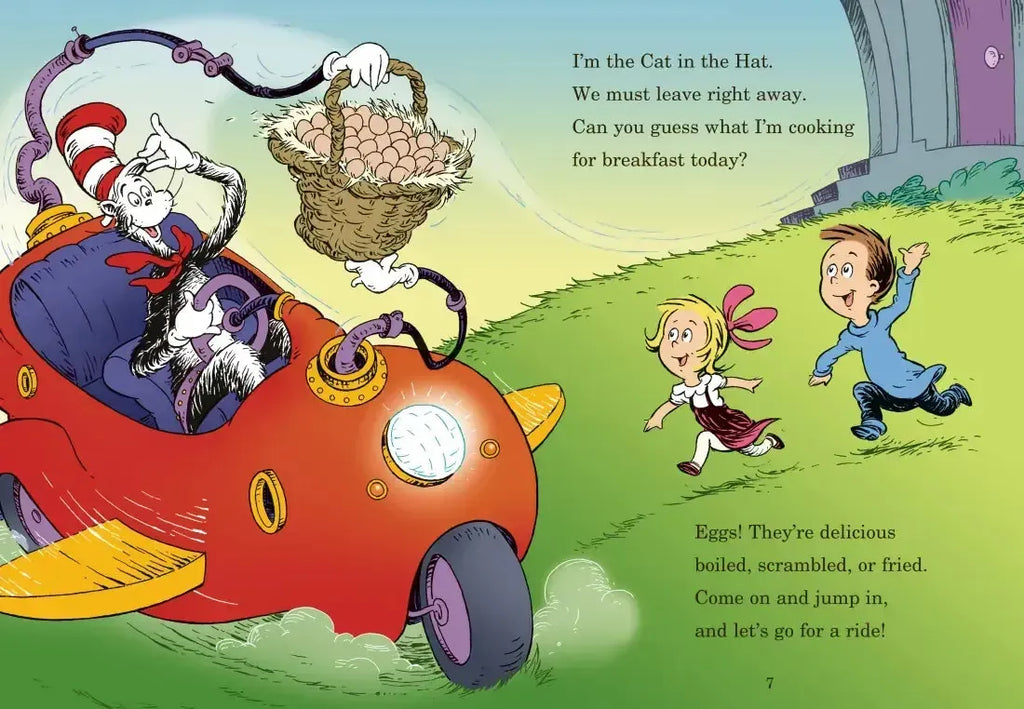 “I’m the Cat in the Hat. We must leave right away. Can you guess what I’m cooking for breakfast today!”