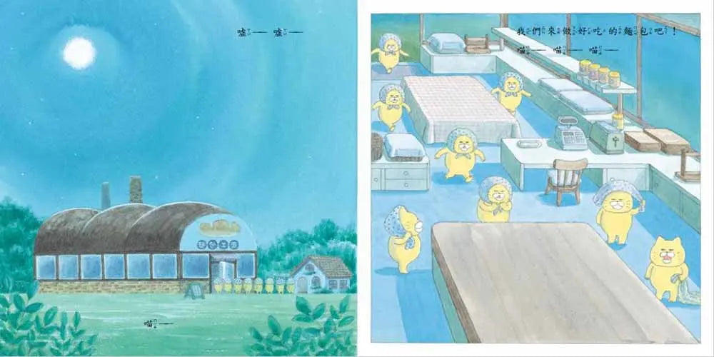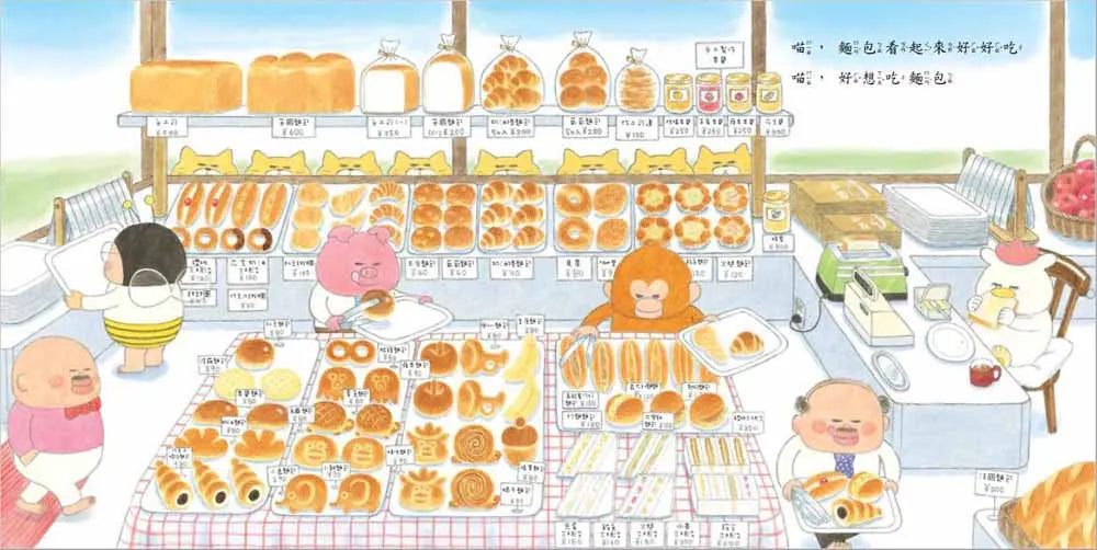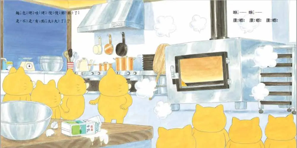 野貓軍團的故事雖然簡單,卻包含起承轉合的完整故事情節。起:偷看麵包製作過程,引起動機→承:半夜潛入工廠,模仿汪汪做麵包→轉:發粉放太多,導致工廠爆炸→合:受到處罰,幫忙賣麵包及重建工廠;這樣的內容既可以滿足能夠理解因果關係的孩子,也能滿足樂於觀察畫面細節的小小孩。作者表示,她花了很多精神在展現小貓的表情,因為只要稍微有些差距,看起來就不可愛了;還有對於麵包,她也下了不少功夫,除了要把麵包畫的看起來很好吃,在麵包店裡的出現的麵包,都是作者小時候(昭和時期)喜歡的,跟現在相較之下,明顯較為樸實。看完這個故事,有沒有讓你跟作者一樣,愈畫(看)肚子愈餓,愈想吃麵包了呢?