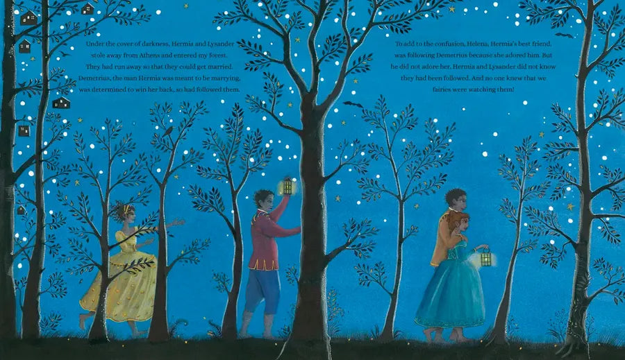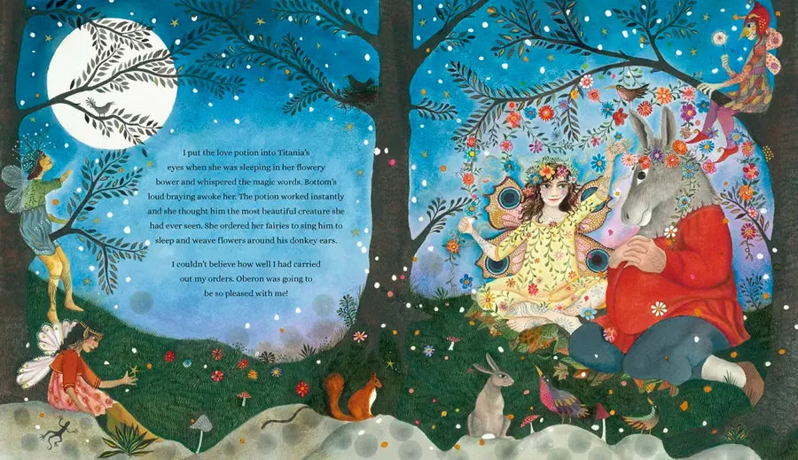 There’s trouble in the Fairy Kingdom. King Oberon wants to teach Titania, his proud wife, a lesson. Things heat up when four young nobles arrive in the enchanted forest from Athens. They’re all in love—but with the wrong person. It’s up to Puck, a playful sprite who isn’t above a bit of mischief after dark, to do his master’s bidding, trick Queen Titania, and dial down the drama among foolish lovers. With a certain potion at his disposal, what could go wrong? Retold from Puck’s point of view in simple, accessible language, peppered with quotes from Shakespeare’s original play, and brought to life in Jane Ray’s lush, moonlit illustrations, this introduction to the Bard’s most enchanting comedy hints at the richness of his work while being a lovely keepsake edition in its own right.