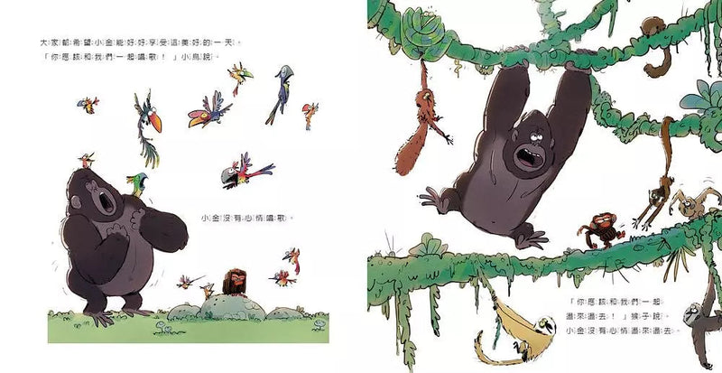 繪者運用鮮明豐富的顏色及逗趣可愛的圖像,呈現森林裡動物們的體態和樣貌,每一隻動物的特徵都栩栩如生,並且搭配著逗趣耍寶的表情,這樣的圖像能讓翻看此書的讀者感同身受,不自覺也跟著開心了起來。