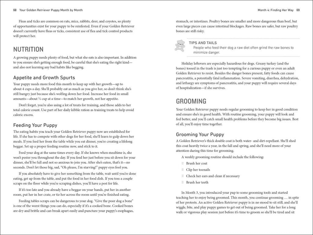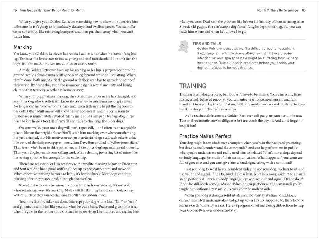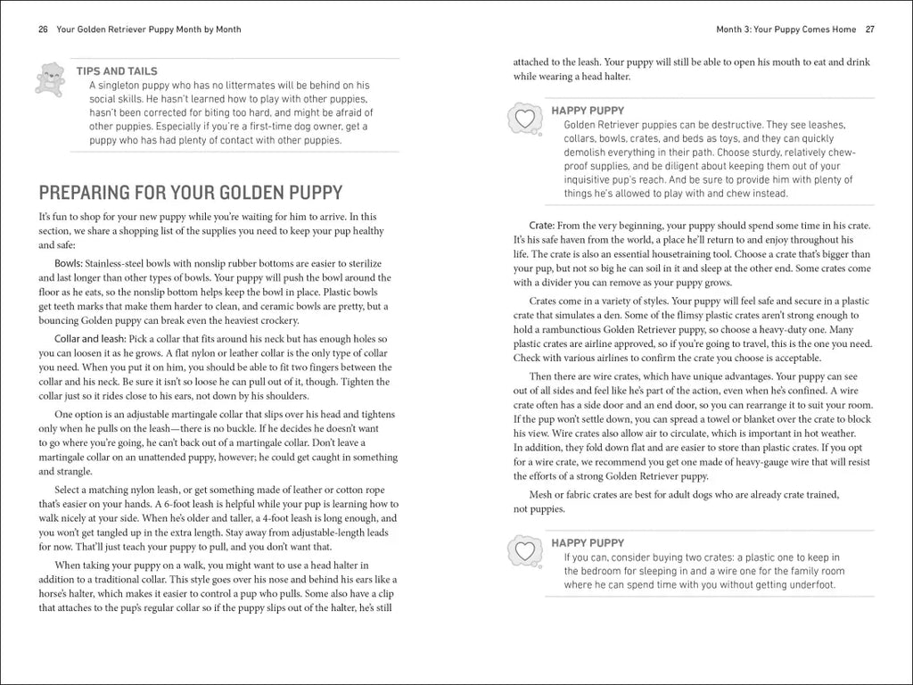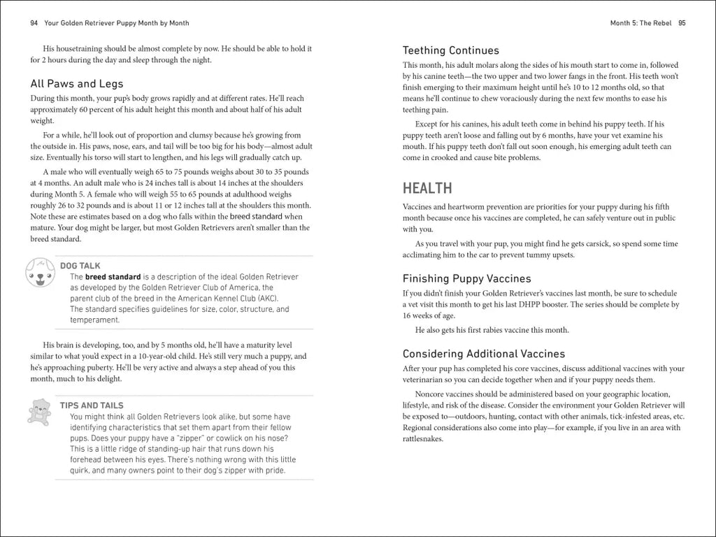 Your Golden Retriever Puppy Month by Month provides new pet owners with everything you need to know and do at each stage of development to make sure your playful, energetic puppy grows into a happy, healthy, and well-adjusted companion. A veterinarian, a trainer, and a breeder team up to cover all the questions new owners tend to have, and many they don’t think to ask, including: