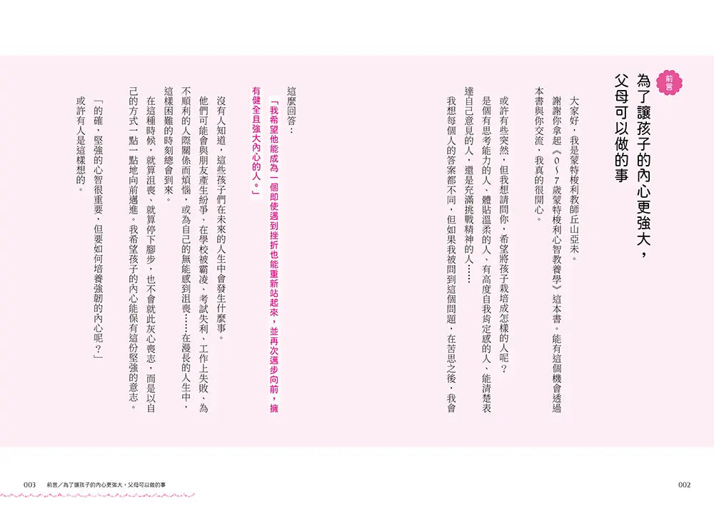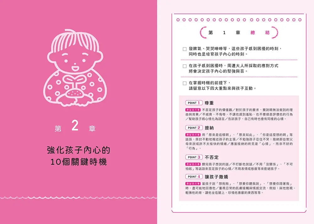 作者丘山亞未認為,想培養孩子堅強的內心,關鍵不在於「管」,而在於「懂」。只要在孩子最需要你的時刻,掌握正確的互動核心──尊重、接納、不否定與讓他撒嬌,就能建立穩固的信賴關係,引導他發展出健全、能自我調適的情緒力。