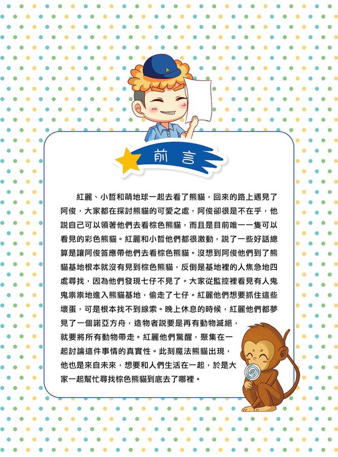 紅麗、小哲和萌地球一起去看了熊貓,回來的路上遇見了阿俊,大家都在探討熊貓的可愛之處,阿俊卻很是不在乎,他說自己可以領著他們去看棕色熊貓,而且是目前唯一一隻可以看見的彩色熊貓。紅麗和小哲他們都很激動,說了一些好話總算是讓阿俊答應帶他們去看棕色熊貓。沒想到阿俊他們到了熊貓基地根本就沒有見到棕色熊貓,反倒是基地裡的人焦急地四處尋找,因為他們發現七仔不見了。大家從監控裡看見有人鬼鬼祟祟地進入熊貓基地,偷走了七仔。紅麗他們想要抓住這些壞蛋,可是根本找不到線索。晚上休息的時候,紅麗他們都夢見了一個諾亞方舟,造物者說要是再有動物滅絕,就要將所有動物帶走。紅麗他們驚醒,聚集在一起討論這件事情的真實性。此刻魔法熊貓出現,他也是來自未來,想要和人們生活在一起,於是大家一起幫忙尋找棕色熊貓到底去了哪裡。