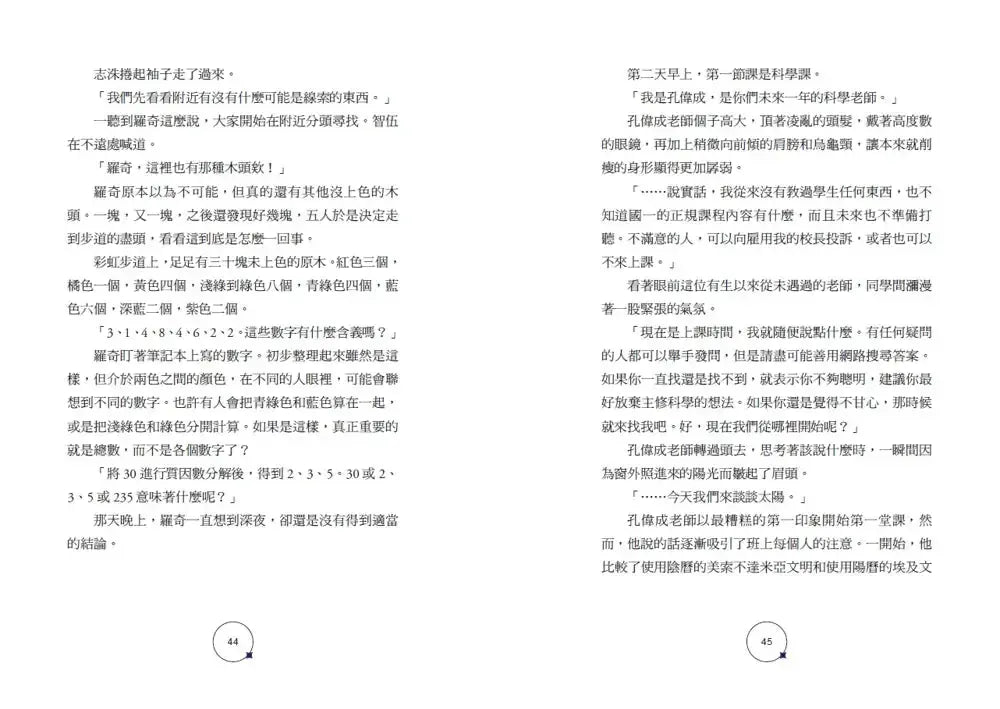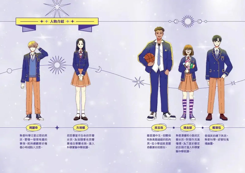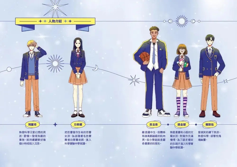 比起解謎的天才,這些人物更像是我們會在周圍遇到的平凡同學。一旦陷入沉思、不管被誰拉走都不知道的羅奇;比起用腦,更喜歡用肌肉解決問題的志洙;精通各式小說漫畫,充滿想像力的金瑟;喜歡科學和老掉牙笑話的智伍;還有為芭蕾不惜付出一切的莉娜。其他老師和同學們也充滿個性,為不同的理由阻礙或協助主角們,為這趟尋找隱藏答案的旅程增添豐富的色彩。
