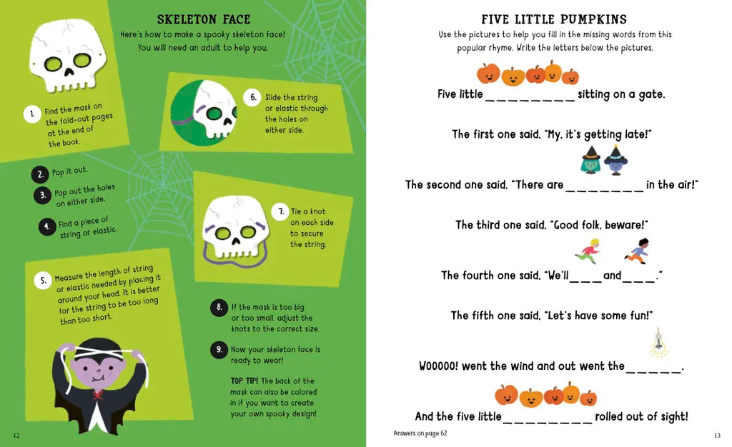 Halloween is such an exciting, fun time for children, and this creative activity book is the perfect way to celebrate the holiday! Readers will love to complete the delightful puzzles, fun coloring scenes, and Halloween crafts that most children can do themselves and with common household items. This engaging activity book includes an adorable press-out skeleton mask, a door hanger, Halloween-themed stencils, and more than 100 colorful stickers for young artists to decorate their spooky creations.
