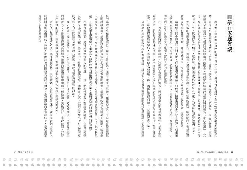 第一部從教養態度、父母作為、親子溝通、家庭力量、規矩原則、理解與包容、尊重孩子的決定、情感的傳遞⋯⋯等,提點出正向教養的27種核心精神。