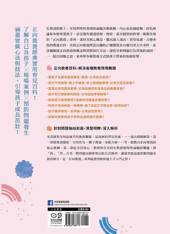 在教養的路上,父母們時時刻刻會面臨各種挑戰,內心也充滿感慨,因為無論你多麼疼愛孩子,必定都有遭逢憤怒、挫折,甚至絕望的時刻。風靡全球的「正向教養」系列,秉持其核心概念,推出深入淺出、實用易讀、方便查找的教養百科,含括正向教養所需具備的27種態度及92種日常大小事件,詳細解說正向教養的概念與實際執行方法,深度分析問題行為背後的成因,一一提出因應之道,並列舉各種教養方式對孩子帶來的後續影響。全書架構簡單易懂,是「正向教養」系列最實用的快速上手入門之作,適用於任何年齡階段的孩子,探討所有你能想到的教養問題,為你提供深入分析及解答。