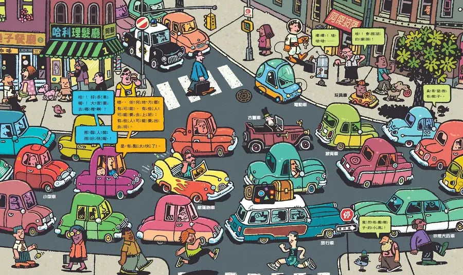 不僅如此,這一路上,亨利學到了許多關於車子的知識,還看到許多戴帽子的小鳥,發現可以從1數到100,而且注意到一些不應該出現在那裡的奇特東西,像是太空人、愛麗絲夢遊仙境裡的兔子、超人裝扮的人,以及有各式花俏的廣告招牌、形形色色的路人等。書裡有好多小故事、玩不完的找找看、許許多多有趣的細節,以及五張汽車、卡車、露營車、腳踏車、摩托車的結構圖,與一張可以鳥瞰城市、擠滿行人、車輛和商店的超大拉頁!