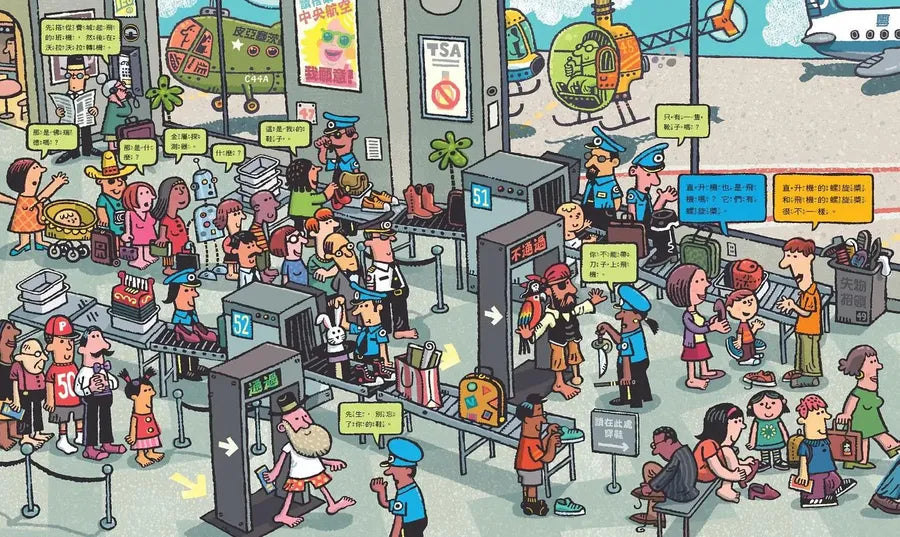 不僅如此,亨利還看到許多戴帽子的小鳥,發現可以從1數到100,而且注意到一些不應該出現在那裡的奇特東西,像是機器人、海盜、超人,還有機場裡形形色色的人群等。書裡有好多小故事、玩不完的找找看、許許多多有趣的細節,以及五張噴射機、飛船、直升機、滑翔機等飛行器的剖面結構圖,與一張可以鳥瞰機場、擠滿車輛和各式飛機的超大拉頁!