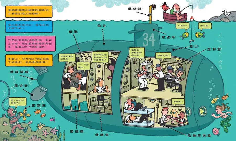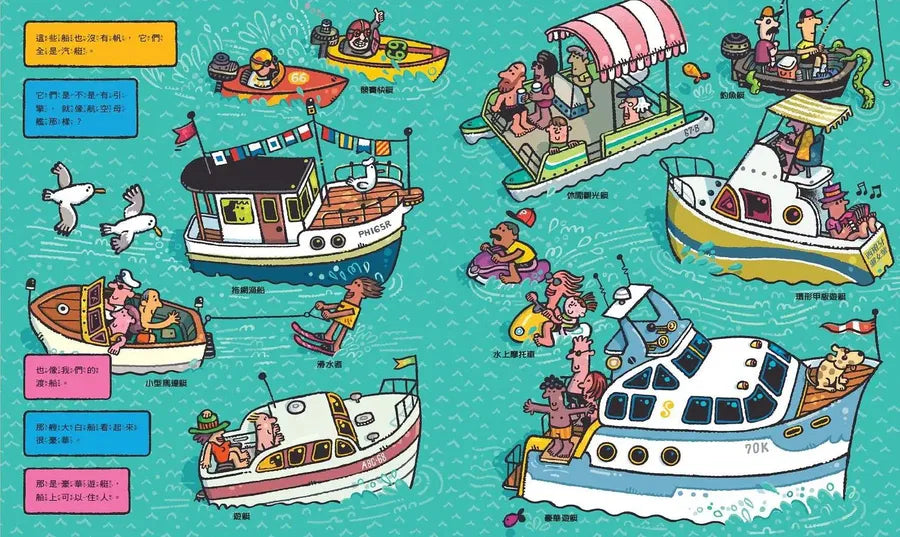 不僅如此,亨利還看到許多戴帽子的小鳥,發現可以從1數到100,而且注意到一些不應該出現在那裡的奇特東西,像是美人魚、戴墨鏡的熊、挪亞方舟,還有形形色色的人群等。書裡有好多小故事、玩不完的找找看、許許多多有趣的細節,以及八張漁船、貨櫃船、潛水艇、航空母艦、帆船、古代帆船、船屋、郵輪等船艦的結構圖,與一張可以鳥瞰港口、擠滿各式船隻的超大拉頁!