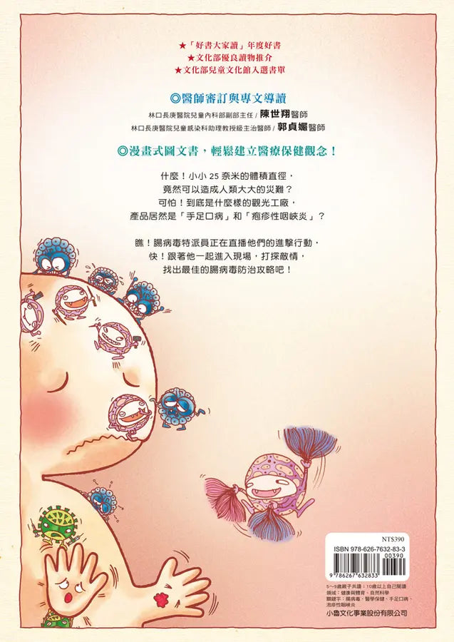 以擬人化的腸病毒特派員吸引孩子的好奇心與注意力,以漫畫式圖文呈現故事,孩子可輕鬆連結自己的生活習慣,認識腸病毒的種類、特性,學習如何養成良好的衛生習慣以及保健方法。