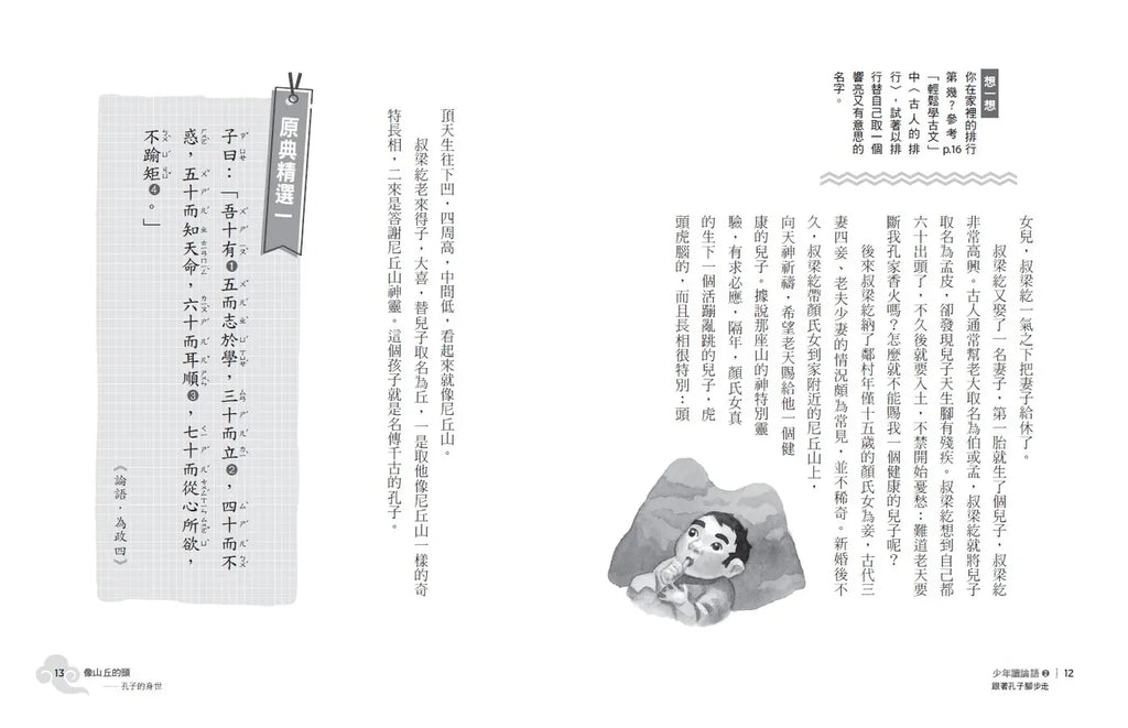 《少年讀論語》提供青少年一個全面認識孔子的機會,了解他的生平,看他遇過那些人生難關,也認識一下他那些多才多藝的門生,讓孩子心中模糊的哲人形象更清晰,知道孔子也是個有血有淚、會犯錯有時甚至會強詞奪理的人,而不是高高在上的聖人。