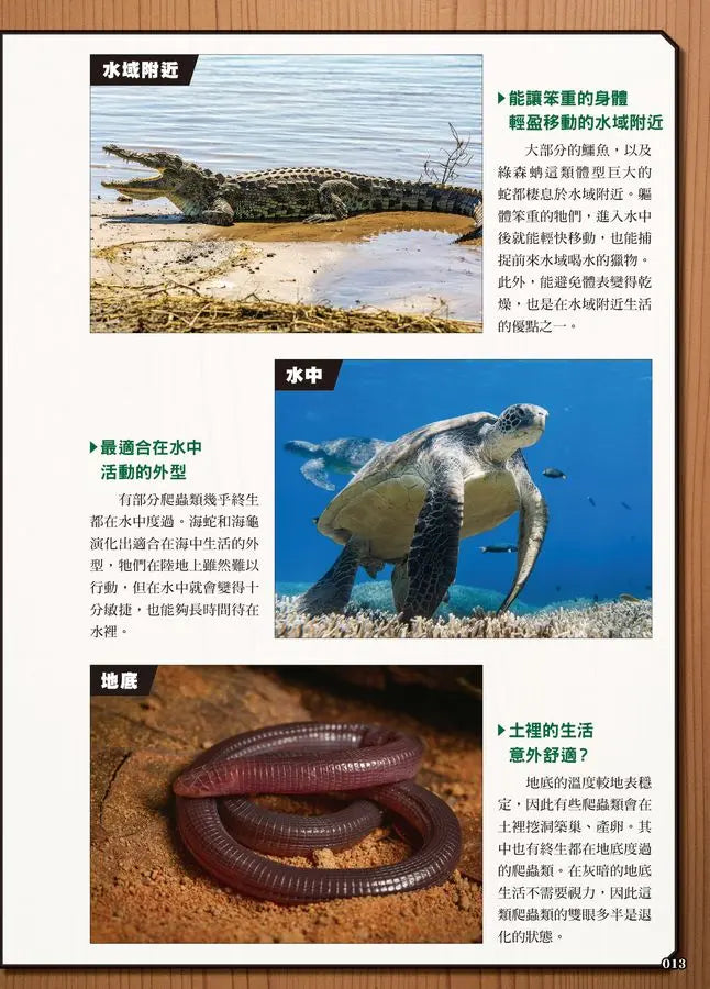 ★鱷魚、蜥蜴、蛇類、龜鱉等爬蟲類齊聚一堂,在書中進行「模擬戰」,藉由戰鬥過程介紹其生物特質與習性。