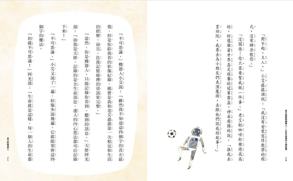特色1.想像力與科技現實的跨界結合:巧妙融合科技與想像,透過老艾、機器人與天使阿光的互動與對話描寫出對記憶、情感、老去與存在的深刻思考。