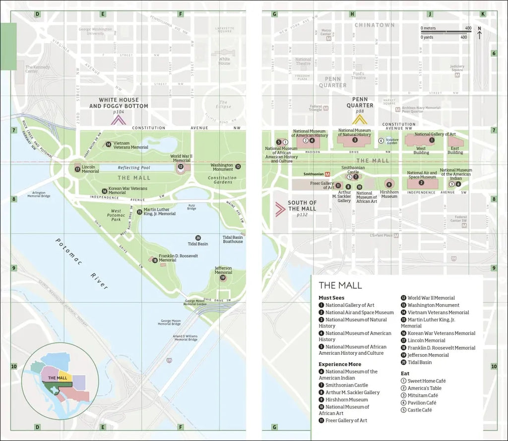 - Color-coded chapters to every part of Washington DC, from Capitol Hill to Penn Quarter, The Mall to Georgetown