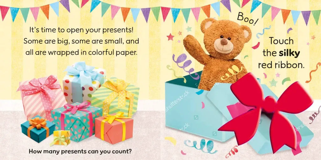 Like your very own present, unwrap this book to discover a world of birthday fun! Put on your fuzzy hat, then head to the party where colorful rubbery balloons wait. But what’s inside the big present? Tear the shiny and smooth wrapping paper to find out!