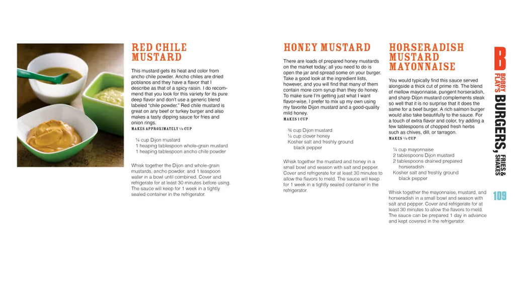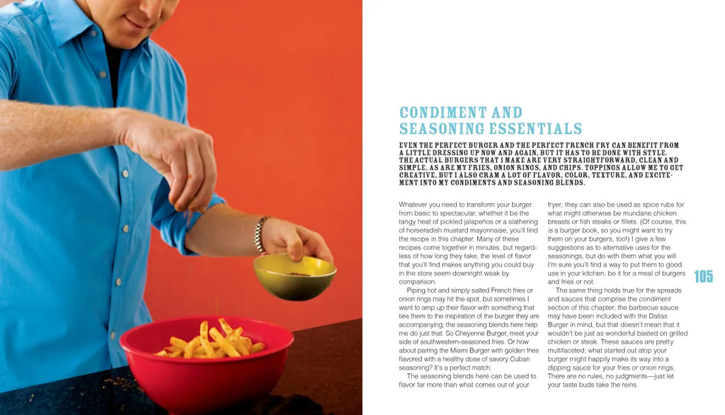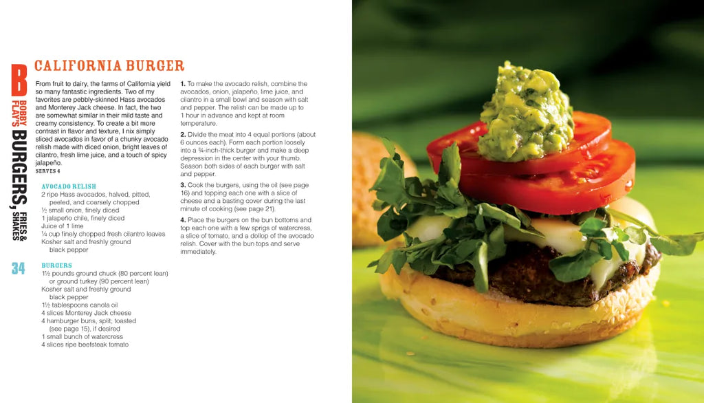 Though he doesn’t believe in messing with delicious certified Angus chuck (just salt and pepper on the patty–no “meatloaf” burgers here), Bobby loves adding flavorful relishes and condiments to elevate the classic burger. Once you’ve learned what goes into making that burger (from how to shape it so it cooks up perfectly to melting the cheese just so), go to town with Bobby's favorite combinations of additions. Try the Cheyenne Burger, which gets slathered with homemade barbecue sauce and then piled high with bacon and shoestring onion rings, or the Santa Fe Burger, topped with a blistered poblano, queso sauce, and crumbled blue corn tortilla chips. And although Bobby’s personal preference is for beef, turkey can be substituted in any burger, and a handful of salmon and tuna burger recipes are included for those looking for leaner options.