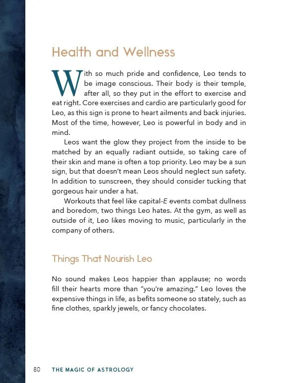 • Beautiful illustrations and helpful charts throughout feature each sign’s classic and lesser-known traits, tips on travel and décor, communication style, health and wellness, and beyond.